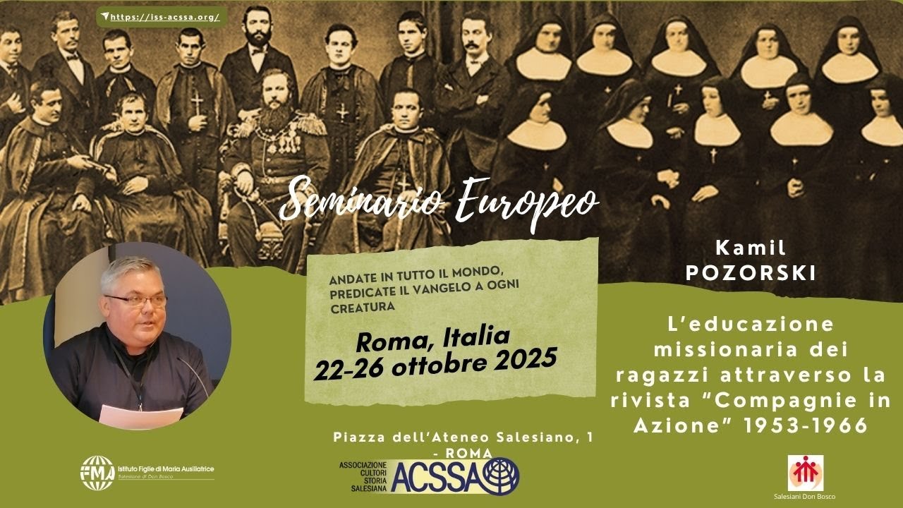 - Roma, 22-26 ottobre 2025 Seminario Europeo ACSSA Missioni salesiane nel mondo. Apporto dei Salesiani e delle Figlie di Maria Ausiliatrice L’educazione missionaria dei ragazzi attraverso la rivista Compagnie in Azione 1953-1966, Kamil Pozorski Moderatrice: Bernadeta Lewek, Vice-Presidente ACSSA Polonia
