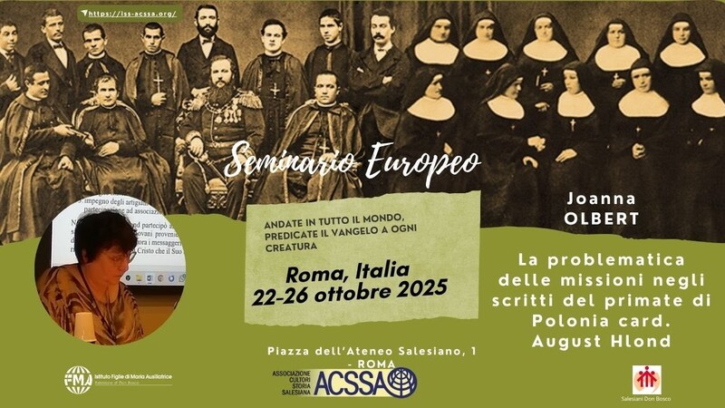- Seminario Europeo ACSSA 2025, Associazione dei Cultori di storia salesiana, Joanna Olbert Roma, 22-26 ottobre 2025 Seminario Europeo ACSSA Missioni salesiane nel mondo. Apporto dei Salesiani e delle Figlie di Maria Ausiliatrice La problematica delle missioni negli scritti del primate di Polonia card. August Hlond, Joanna Olbert Moderatore: Paolo Vaschetto, Docente all'UPS e membro dell'ISS