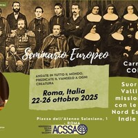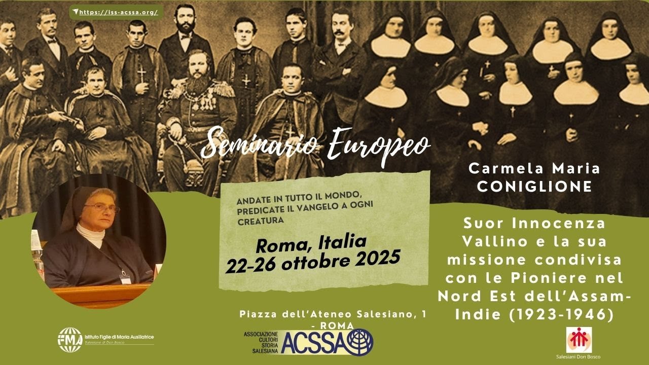 - Roma, 22-26 ottobre 2025 Seminario Europeo ACSSA Missioni salesiane nel mondo. Apporto dei Salesiani e delle Figlie di Maria Ausiliatrice Suor Innocenza Vallino e la sua missione condivisa con le Pioniere nel Nord Est dell'Assam-Indie (1923-1946), Carmela Maria Coniglione Moderatrice: Maria Maul, Presidente ACSSA