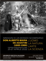 "Don Alberto Maria De Agostini (1883-1960). L’uomo, la natura, l'arte, la scienza" Convegno internazionale di studio (25-27 aprile 2022) promosso dall'Istituto Storico Salesiano, la Congregazione Salesiana e la Facoltà di Scienze della Comunicazione sociale dell'Università Pontificia Salesiana.